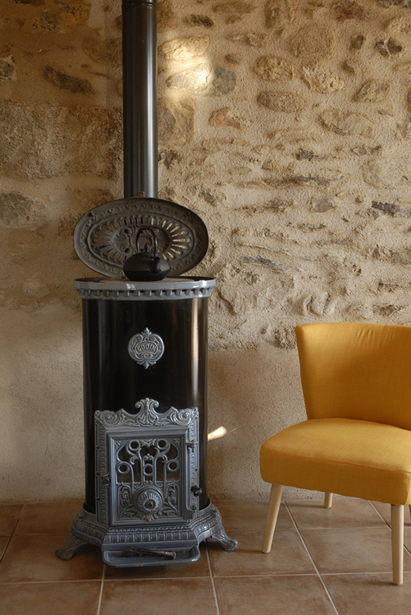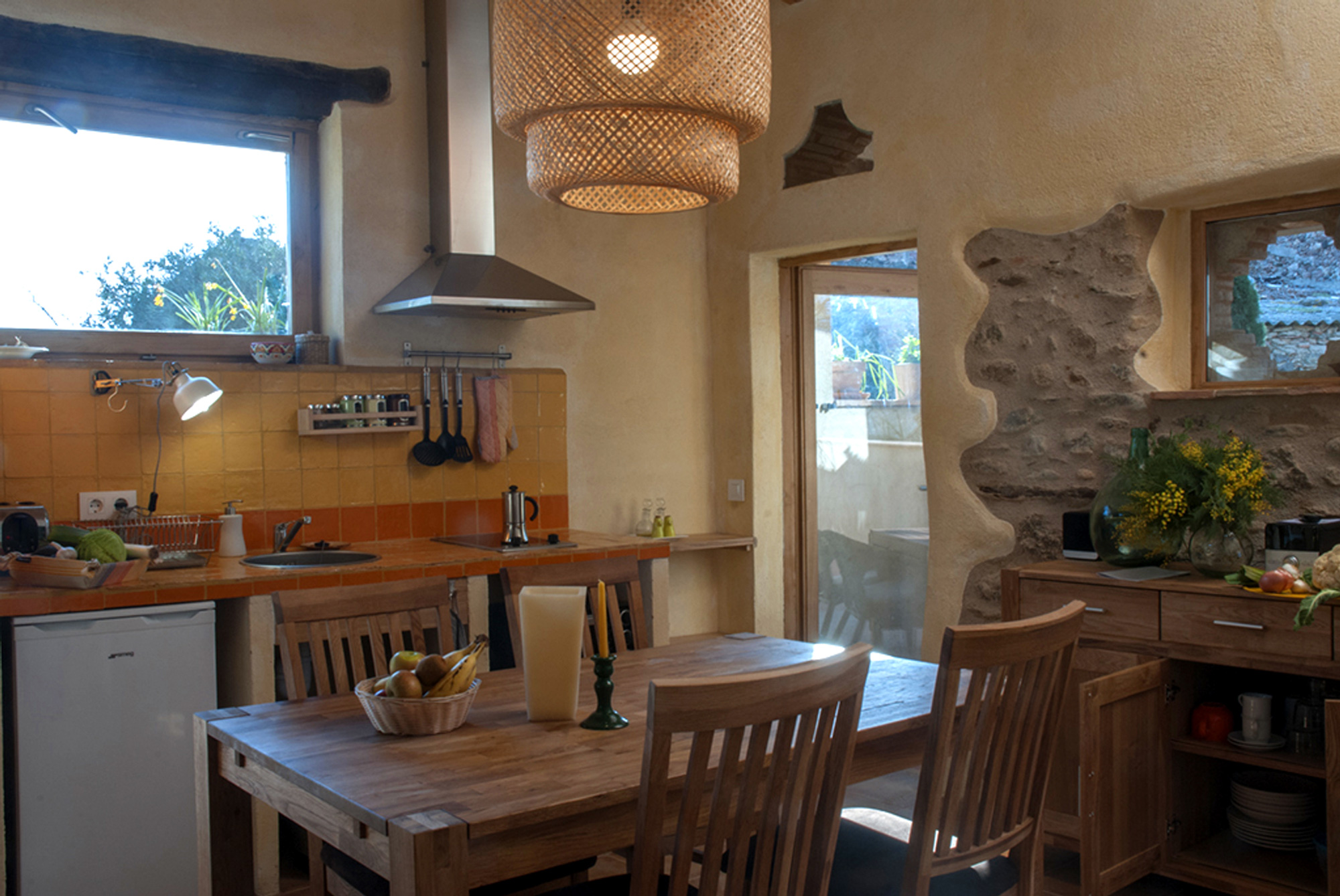 - sala d’estar amb estufa de llenya, taula i cuina equipada